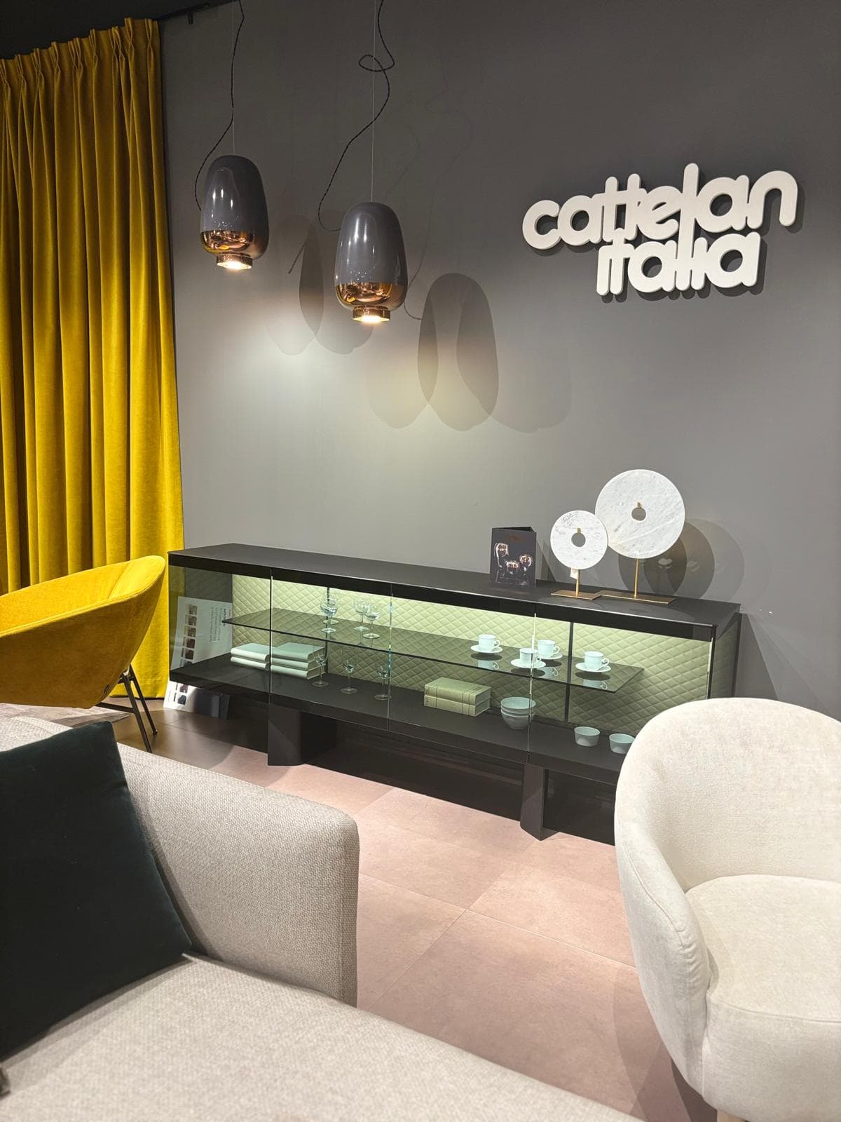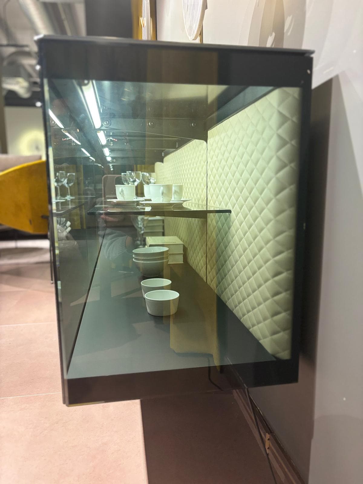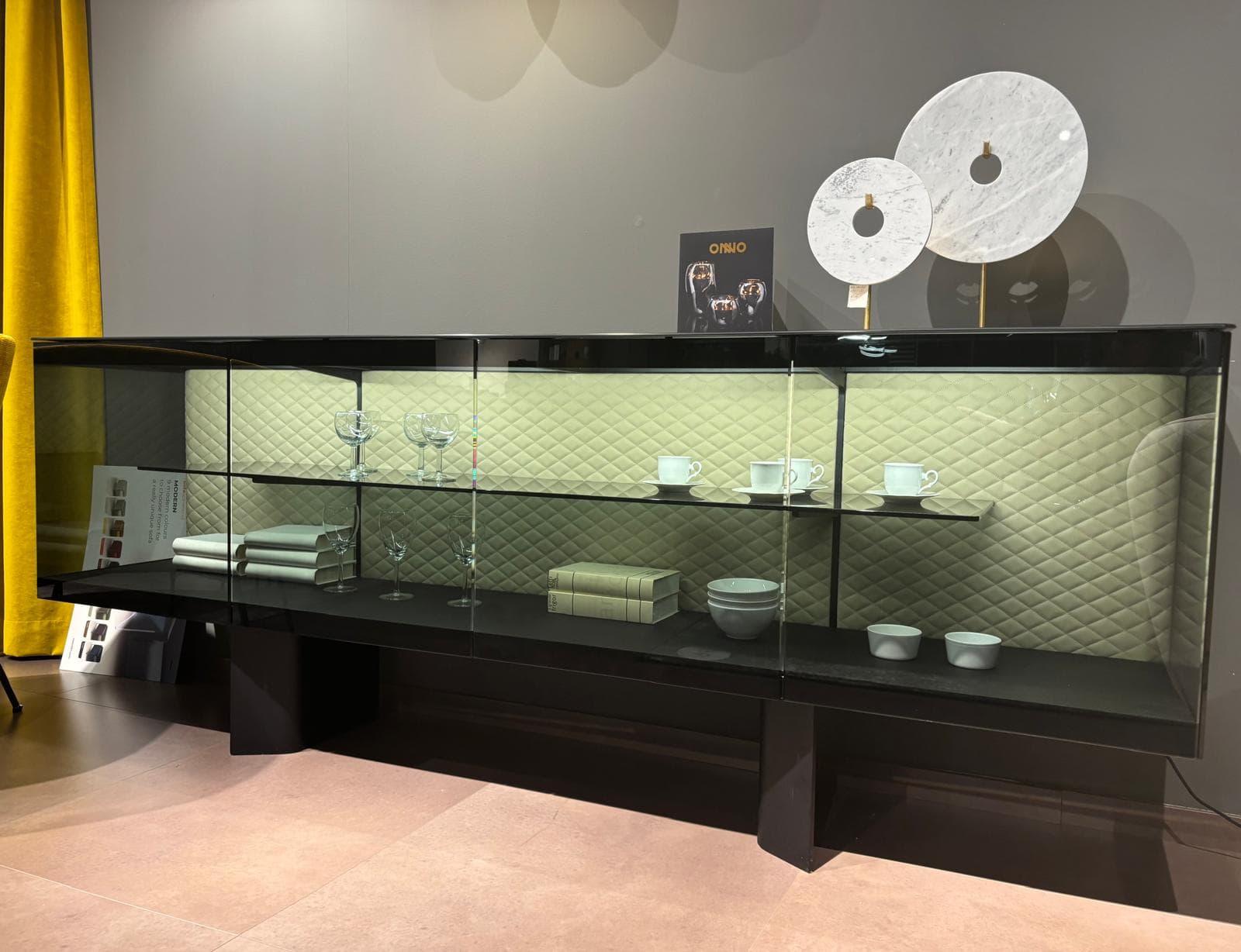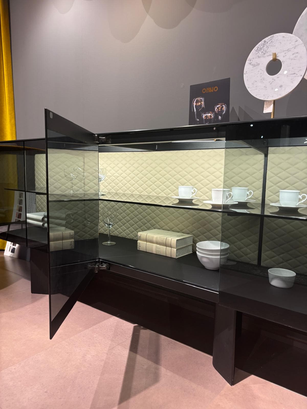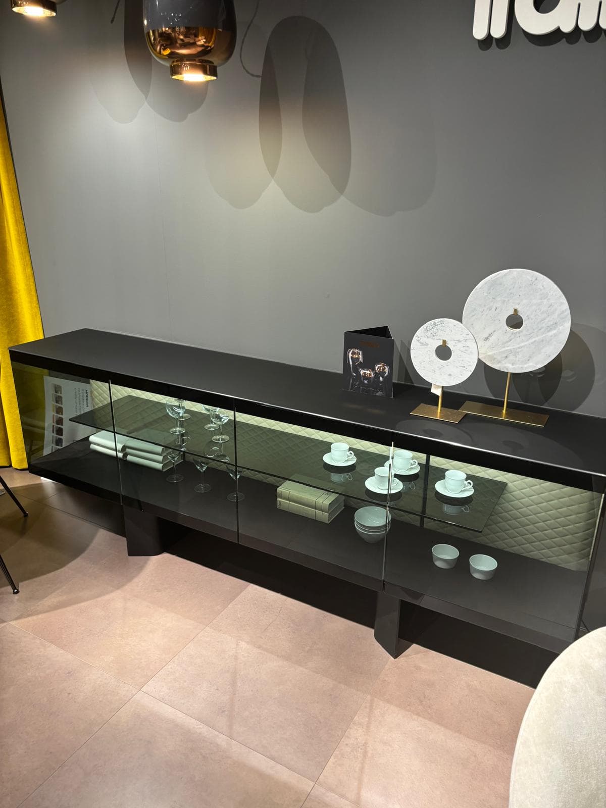 Prevedenie: soft leather Cashmere, dymové sklo, podnož čierna kovová